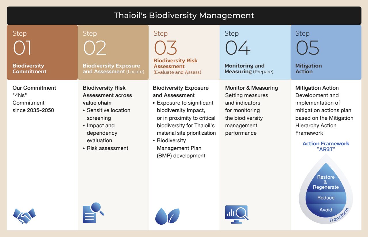 In 2025, Thaioil Group developed a biodiversity management framework in alignment with the Taskforce on Nature-related Financial Disclosures (TNFD) by implementing the LEAP (Locate, Evaluate, Assess, Prepare) framework as a systematic approach to biodiversity management and to analyse nature-related risks and opportunities. The framework comprises five key steps as follows: