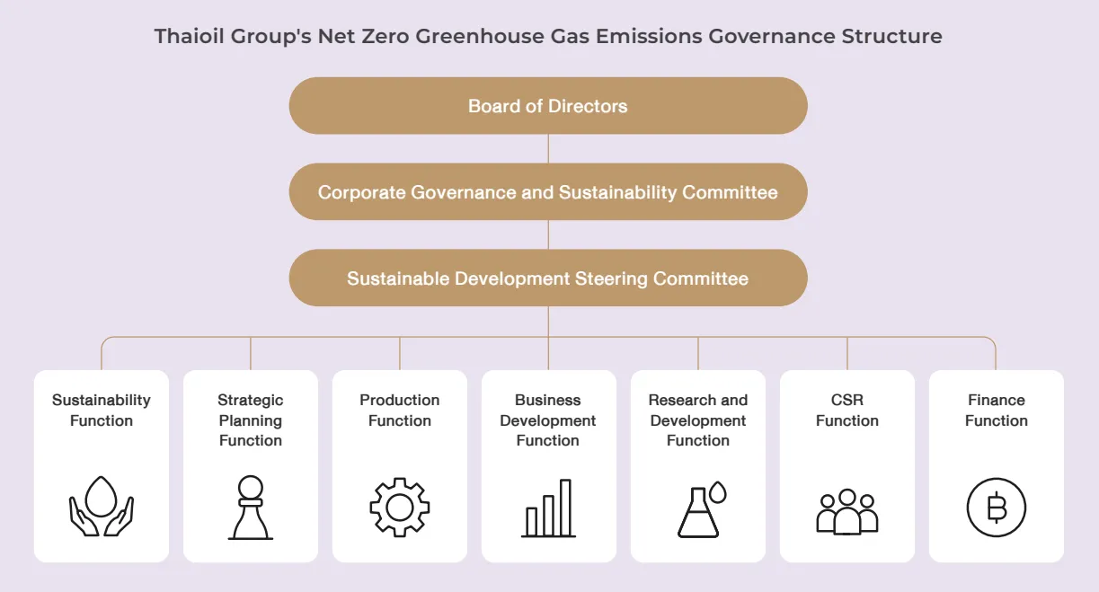 The Board of Directors has assigned the Corporate Governance and Sustainability Committee (Board level) to oversight and monitor the performance of sustainability initiatives, including the management of topics related to climate change on a semi-annually basis. The Sustainable Development Steering Committee (Management level), chaired by the Chief Executive Officer and President, is also assigned to drive the implementation, and monitor the progress on a quarterly basis. The executives of Thaioil Group take responsibility for the management in line with the established strategy. “The Net Zero GHG Emissions Governance Structure” is established where the Vice President of the Sustainability Function is supervising overall management, including the integration of work processes with Corporate Strategy Function, Production Function, Business Development Function, Research and Development Function, and Corporate Social Responsibility Function. The functions have the roles of assessing climate-related risks and opportunities, conducting work in accordance with the organizational climate strategy, developing action plans that align with Thaioil Group’s Net Zero GHG Emissions Pathway and Roadmap, and reporting the performances as well as risks and opportunities management to the committees on a regular basis.