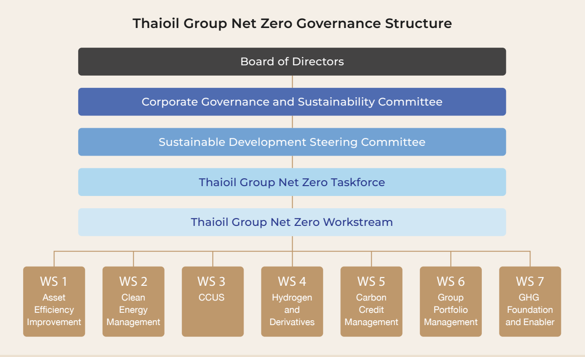 The Board of Directors has assigned the Corporate Governance and Sustainability Committee (Board level) to oversee and monitor the performance of sustainability initiatives, including the management of topics related to climate change at least twice a year. The Sustainable Development Steering Committee (Management level), chaired by the Chief Executive Officer and President, is also assigned to drive the implementation, and monitor the progress on a quarterly basis, while the executives of Thaioil Group take responsibility for the management in line with the established strategy.