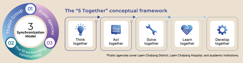 Thaioil Group manages community relations surrounding the refinery based on the “3 Synchronization” model, consisting of the Thaioil Group, the 10 Surrounding Communities, and Public Agencies (including Laem Chabang City Municipality, Laem Chabang Hospital, and educational institutions). This is further strengthened by the “5 Together” concept, which includes: Think Together, Act Together, Solve Together, Learn Together, and Develop Together. This approach ensures that community members are actively involved in developing their own neighborhoods, fostering self-reliance and community resilience, while effectively mitigating any potential impacts from Thaioil Group’s operations.