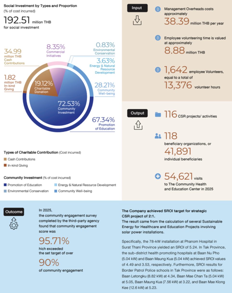 | • 39.25 million THB of corporate reputation (PR value) generated by social development projects in 2025. • The corporate volunteering culture included 1,642 volunteers who took part in 116 CSR activities for a total of 13,376 volunteered hours in 2025. | |||