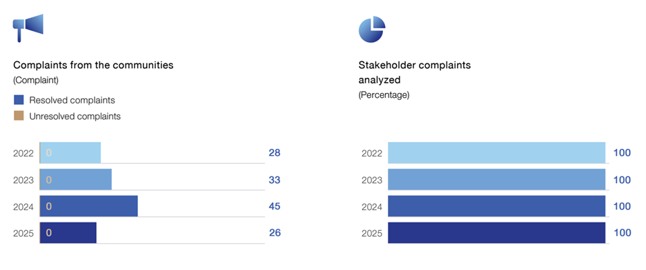 In 2025, there is 26 complaints from the communities. According to the grievance mechanism procedure, the Company investigated and resolved all the submitted complaints, established prevention measures, and notified the complainants of the result.