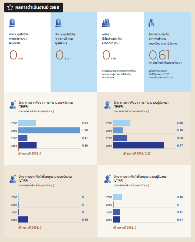 - จากการประเมินระดับวัฒนธรรมความปลอดภัย ในปี 2568 ผลการประเมินที่ 4.15 คะแนนจากคะแนนเต็ม 5.00 คะแนน (ประเมินระดับวัฒนธรรมความปลอดภัยทุกๆ 3 ปี) ซึ่งนำมาด้วยแผนงานพัฒนาวัฒนธรรมความปลอดภัย ซึ่งทางบริษัทฯ จะดำเนินการตามแผนงานที่ระบุไว้เพื่อให้พนักงานและผู้รับเหมามีความตระหนักและให้องค์กรก้าวเข้าสู่องค์กรที่ปราศจากอุบัติเหตุ