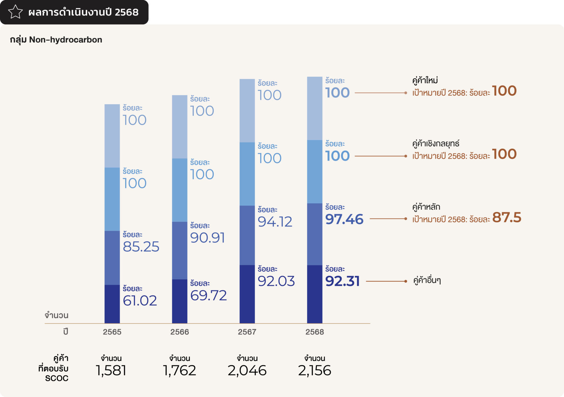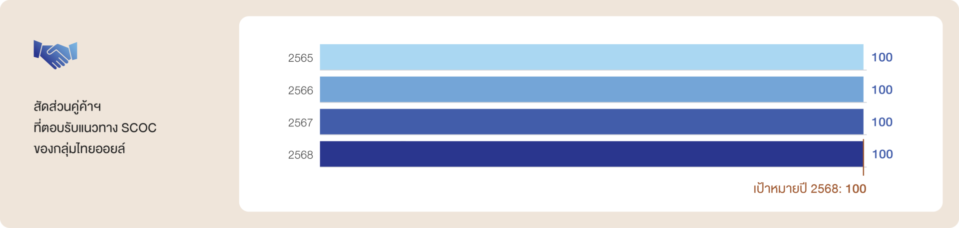 กลุ่มไทยออยล์มี SCOC เป็นแนวทางในการกำกับดูแลและสื่อสารให้แก่คู่ค้าฯ เพื่อตอบรับและปฏิบัติให้สอดคล้องกับการดำเนินงานด้านความยั่งยืนของกลุ่มไทยออยล์ ทั้งนี้ ในปี 2568 คู่ค้าน้ำมันดิบและวัตถุดิบเชิงกลยุทธ์ทางตรง ร้อยละ 100 ได้ตอบรับแนวทาง SCOC ของกลุ่มไทยออยล์ และมีการดำเนินงานที่สอดคล้องกับ SCOC ของกลุ่มไทยออยล์ โดยไม่พบประเด็นความเสี่ยงด้าน ESG ที่อาจสร้างผลกระทบต่อธุรกิจ