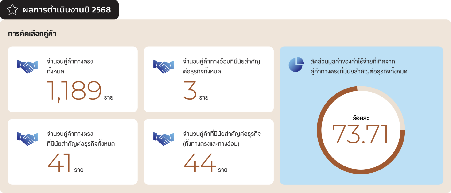 ยกระดับความร่วมมือระหว่างบริษัทฯ กับคู่ค้าควบคู่ไปกับงานจัดซื้อจัดจ้างที่เป็นเลิศและเป็นธรรมอย่างยั่งยืน เพื่อให้เกิดการเพิ่มคุณค่าด้าน ESG และนวัตกรรมร่วมกัน ได้แก่