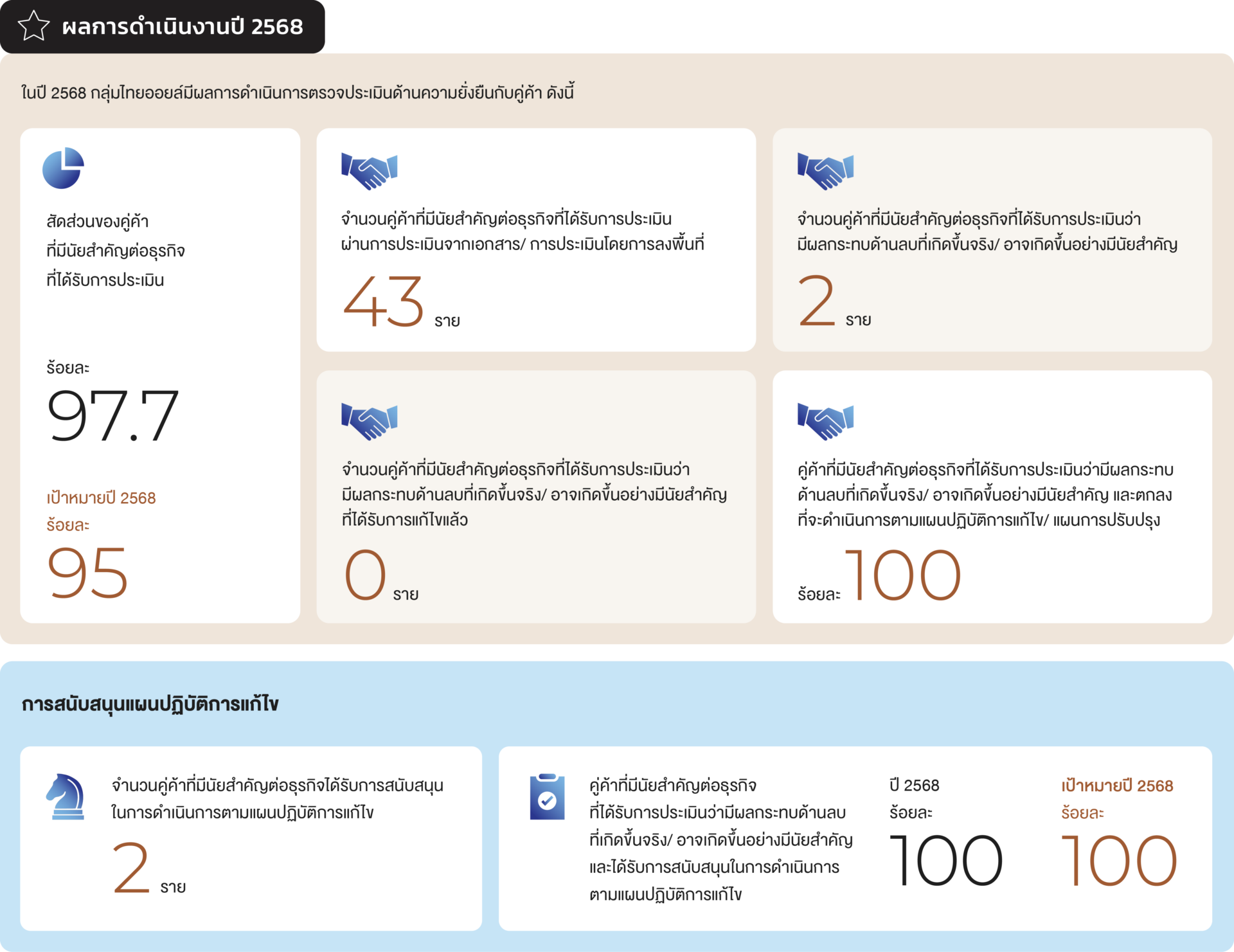 ในปี 2568 กลุ่มไทยออยล์ได้ดำเนินการตรวจประเมินด้านความยั่งยืนกับคู่ค้า ดังนี้