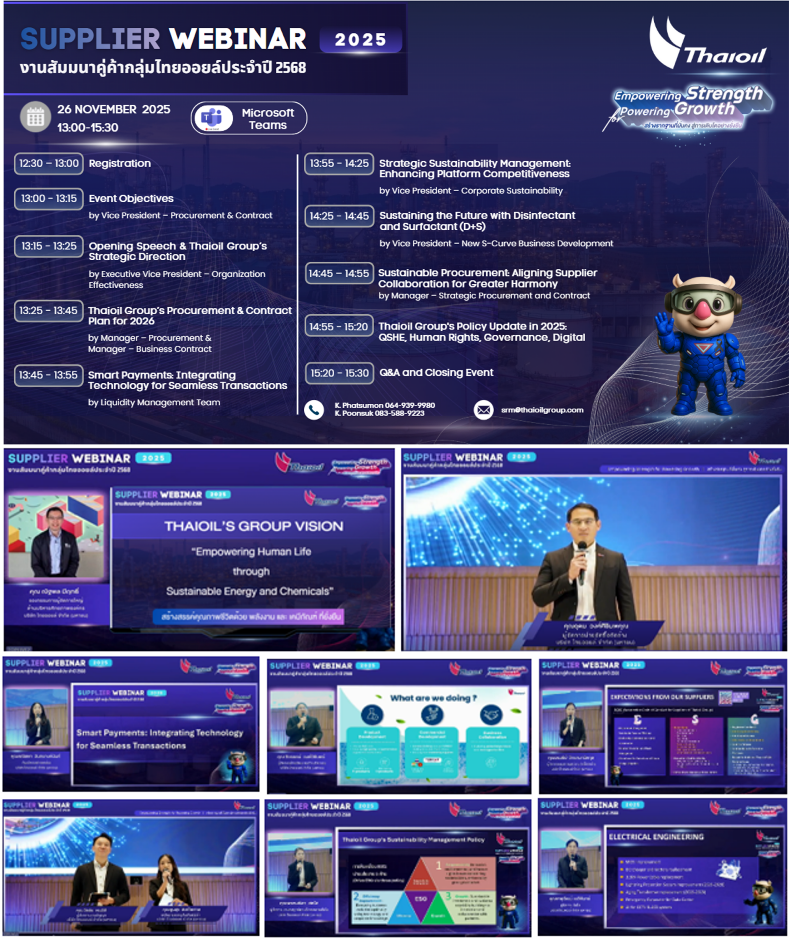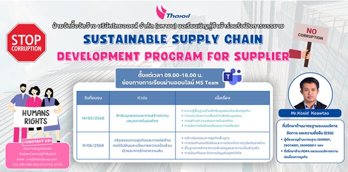 งานสัมมนาคู่ค้ากลุ่มไทยออยล์ซึ่งจัดเป็นประจำทุกปี เพื่อสื่อสารวิสัยทัศน์ของกลุ่มไทยออยล์และสถานการณ์ในปัจจุบันตั้งแต่วิสัยทัศน์และทิศทางกลยุทธ์กลุ่มไทยออยล์ แผนงานจัดซื้อจัดจ้างกลุ่มไทยออยล์ ปี 2569 การบริหารจัดการความยั่งยืนกลุ่มไทยออยล์ กลยุทธ์ 2S1P (Strengthening the Core, Sustaining the Future, Powering the Platform) แนวทางปฏิบัติอย่างยั่งยืนของคู่ค้ากลุ่มไทยออยล์ (Sustainable Code of Conduct for Suppliers of Thaioil Group: SCOC) และ สื่อสารนโยบายของบริษัทฯ เช่น นโยบายคุณภาพ ความมั่นคง ความปลอดภัย อาชีวอนามัย สิ่งแวดล้อมและการจัดการพลังงาน นโยบายธุรกิจและสิทธิมนุษยชนสำหรับคู่ค้า และนโยบายต่อต้านการทุจริต เป็นต้นนอกจากนี้ เพื่อให้คู่ค้ามีความรู้ความเข้าใจเกี่ยวกับความยั่งยืน สามารถนำความรู้ที่ได้รับในการสัมมนาครั้งนี้ไปประยุกต์ใช้ในบริษัทของคู่ค้า และสนับสนุนการพัฒนาอย่างยั่งยืนของกลุ่มไทยออยล์