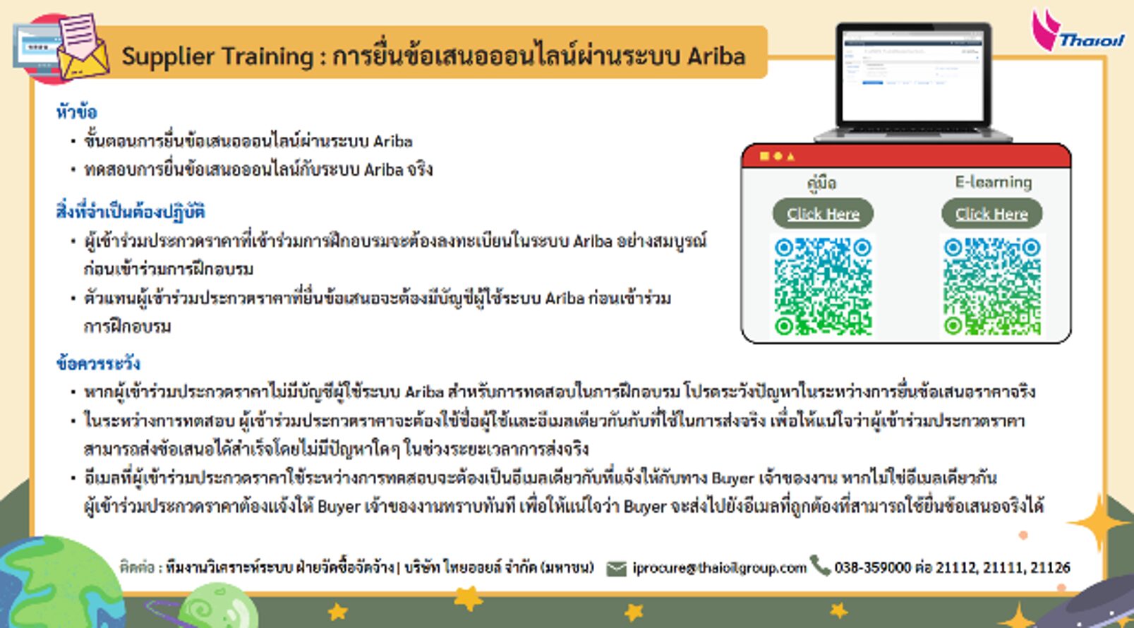 ในปี 2568 กลุ่มไทยออยล์ยังดำเนินการพัฒนาระบบอิเล็กทรอนิกส์ “E-procurement” อย่างต่อเนื่องเพื่อให้กระบวนการจัดซื้อจัดจ้างมีความโปร่งใส (Clear) เป็นธรรม (Fair) อย่างมืออาชีพ (Professional) โดยได้รับความร่วมมือจากคู่ค้ามากขึ้น และทำให้คู่ค้าได้รับประโยชน์ ลดต้นทุน ประหยัดเวลาในการเดินทาง ส่งผลต่อความพึงพอใจของคู่ค้า รวมไปถึงการนำระบบเทคโนโลยีที่น่าเชื่อถือ มาใช้ในกระบวนการจัดซื้อจัดจ้าง อาทิเช่น การนำระบบ SAP Ariba มาใช้ในการขึ้นทะเบียนคู่ค้า การยื่นซองประกวดราคา การรับใบสั่งซื้อสั่งจ้างแบบออนไลน์ และนำระบบ DocuSign มาใช้ในการลงนามสัญญาแบบ Digital Signature และได้มีจัดการฝึกอบรมคู่ค้าในการใช้งานระบบระบบ SAP Ariba อีกด้วย