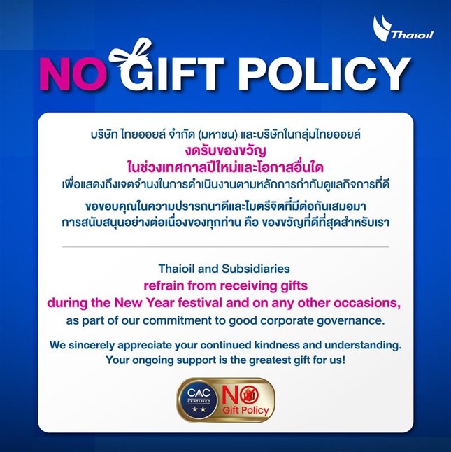 การสื่อสารผ่านกิจกรรมสานสัมพันธ์ เพื่อให้ได้คู่ค้าได้รับทราบ เข้าใจ และปฏิบัติตามเจตนารมณ์ด้านความโปร่งใสในงานจัดซื้อจัดจ้างกลุ่มไทยออยล์ อาทิ นโยบายการงดรับของขวัญและของกำนัล (No Gift Policy) เป็นต้น