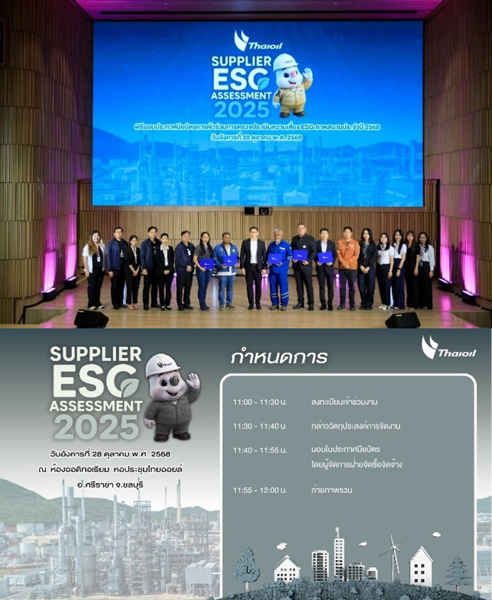 การตรวจประเมินด้านความยั่งยืน (ESG) ภาคสนามประจำปี 2568 หรือ Supplier ESG On-Site Assessment 2568) ณ พื้นที่ปฏิบัติงานของคู่ค้า โดยกลุ่มไทยออยล์ร่วมกับสถาบันรับรองมาตรฐานไอเอสโอ (สรอ.) เพื่อให้คู่ค้าได้รับคำแนะนำ รวมทั้งสามารถนำไปปรับปรุงและพัฒนาด้านความยั่งยืน (ESG) ต่อไป หลังจากจบการตรวจประเมิน ได้มีพิธีมอบประกาศนียบัตรแก่คู่ค้าที่เข้าร่วมการตรวจประเมินและมีการแบ่งปันองค์ความรู้จากบริษัทคู่ค้าที่มีผลการประเมินสูงสุดในแต่ละมิติของ ESG อีกด้วย