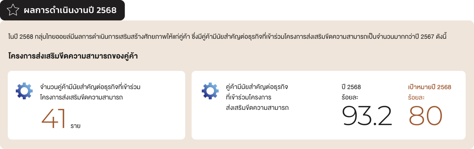 ในปี 2568 กลุ่มไทยออยล์มีผลการดำเนินการเสริมสร้างศักยภาพให้แก่คู่ค้า ซึ่งมีคู่ค้ามีนัยสำคัญต่อธุรกิจที่เข้าร่วมโครงการส่งเสริมขีดความสามารถเป็นจำนวนมากกว่าปี 2567 ดังนี้