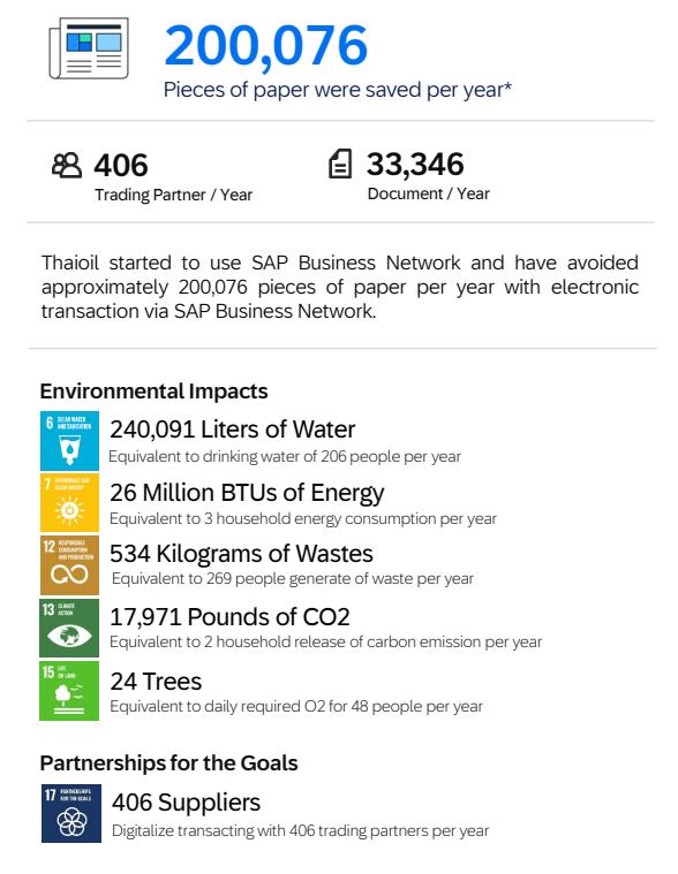 กลุ่มไทยออยล์ยังผลักดันการยืนยันใบสั่งซื้อแบบออนไลน์ (Online PO) แก่คู่ค้าอย่างต่อเนื่องผ่านระบบ E-procurement ให้มากที่สุด เพื่อช่วยลดขั้นตอนระหว่างกัน เพิ่มความสะดวกและรวดเร็วให้แก่คู่ค้า พร้อมสนับสนุนด้านสิ่งแวดล้อม จนถึงปัจจุบัน สามารถลดการใช้กระดาษไปได้ประมาณ 200,076 แผ่น/ปี หากคิดตั้งแต่เริ่มใช้ระบบจะลดได้ประมาณ 1,400,532 แผ่น จากการทำธุรกรรมผ่าน Online PO นำไปสู่การใช้ทรัพยากรและพลังงานที่ลดลง