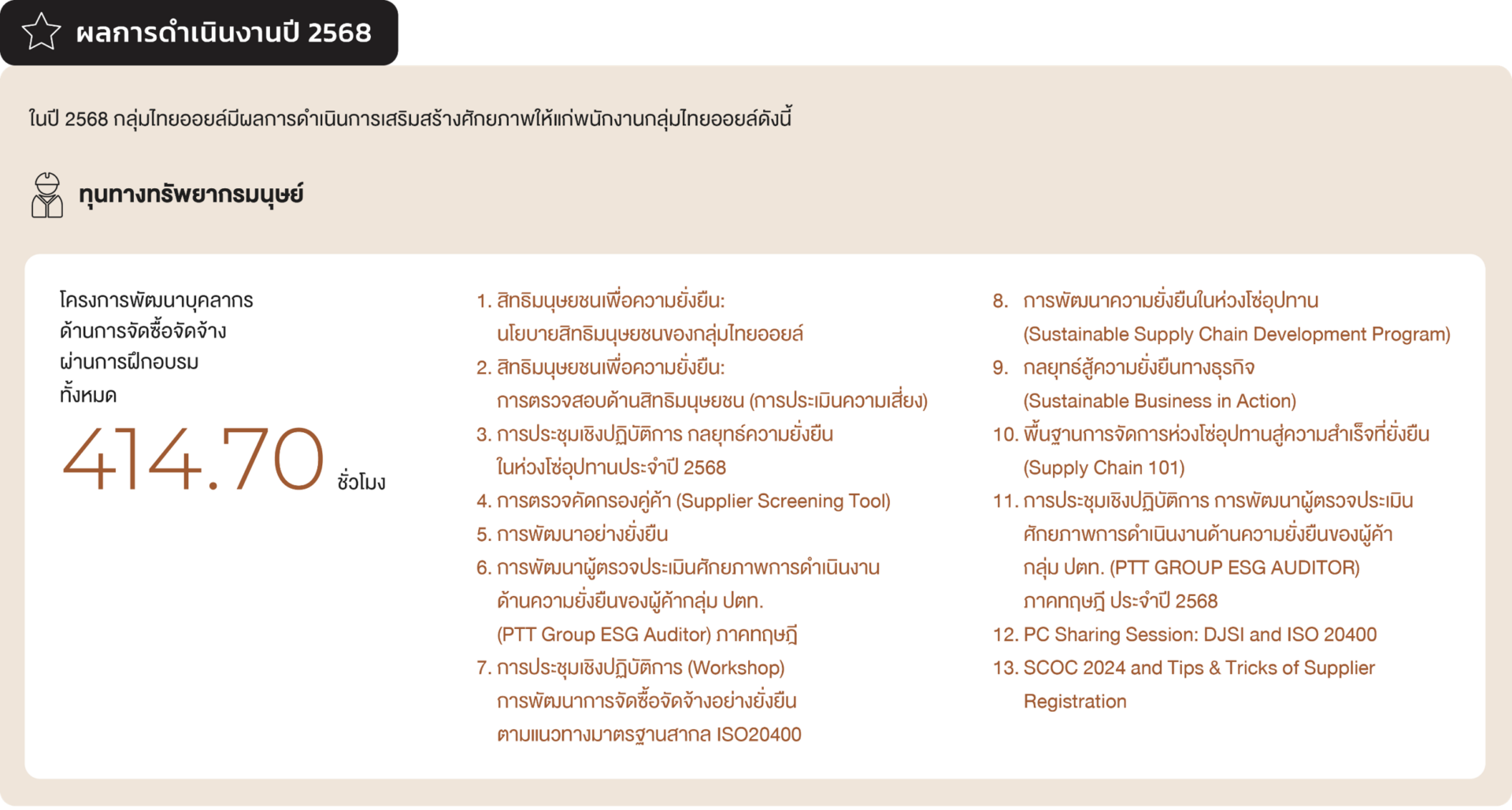 ในปี 2568 กลุ่มไทยออยล์มีผลการดำเนินการเสริมสร้างศักยภาพให้แก่พนักงานกลุ่มไทยออยล์ดังนี้